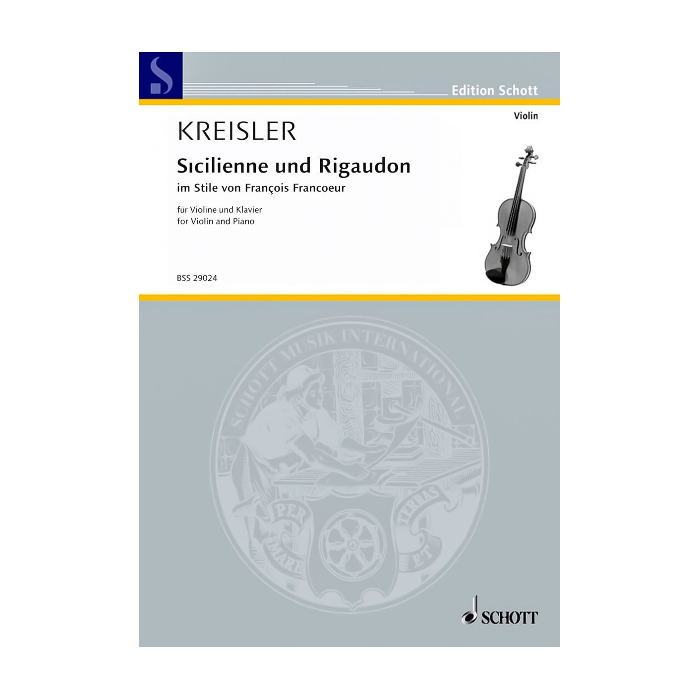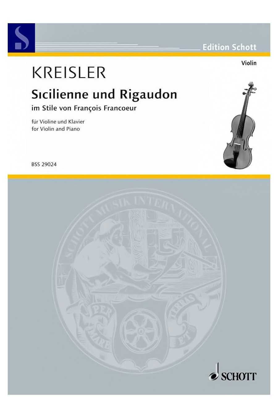 Kreisler's Sicilienne and Rigaudon (Schott) offers two contrasting Baroque-style pieces for violin and piano, ideal for intermediate to advanced performers looking for both lyricism and lively dance character.