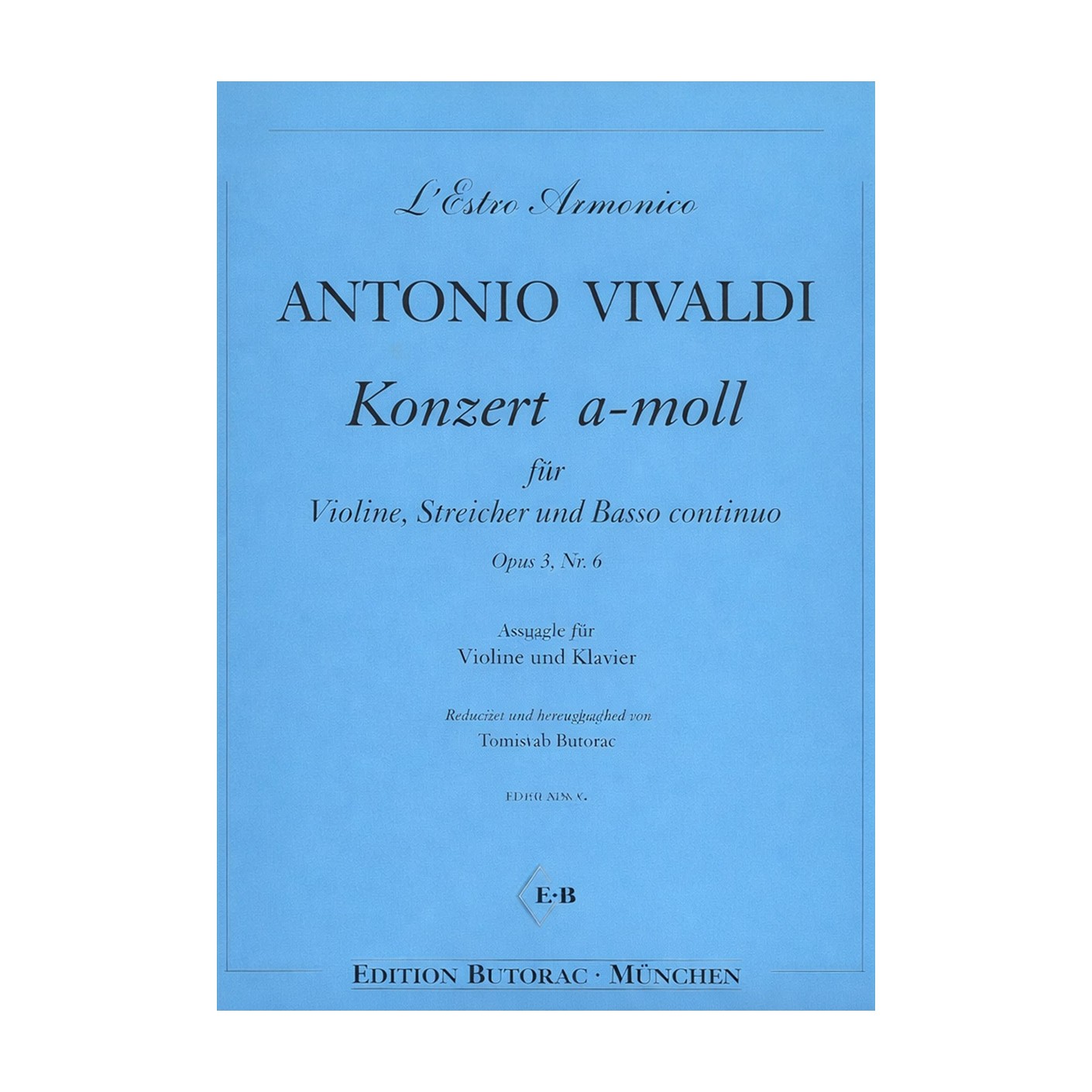 Enter the world of Baroque genius with Antonio Vivaldi’s "L’Estro Armonico, Op. 3 No. 6, Concerto in A Minor," presented in the Edition Butorac, Munchen for violin and piano. First published in 1711 as part of the groundbreaking "L’Estro Armonico" (The Harmonic Inspiration), this set of 12 concertos quickly established Vivaldi’s reputation as a master of inventive melody, rhythmic vitality, and expressive contrast. The A minor concerto stands out for its spirited outer movements and beautifully lyrical Largo, offering violinists a rewarding blend of technical challenge and expressive opportunity. This EBM edition provides clear, accessible notation and a supportive piano reduction, making it perfect for advanced students and professionals preparing for recitals, competitions, or Baroque repertoire study.